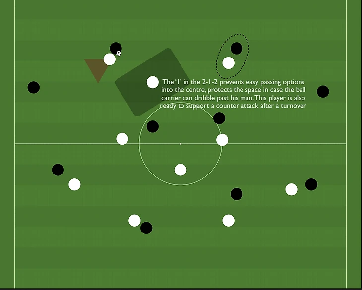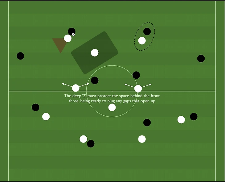 Чувак в центре закрывает зону и подстраховывает прессинг нападающего в случае успешного дриблинга центрального защитника. И помогает в гипотетической контратаке, конечно же.