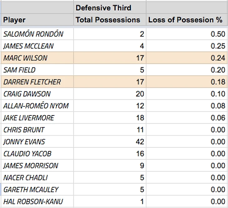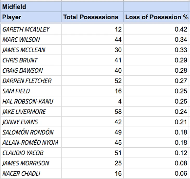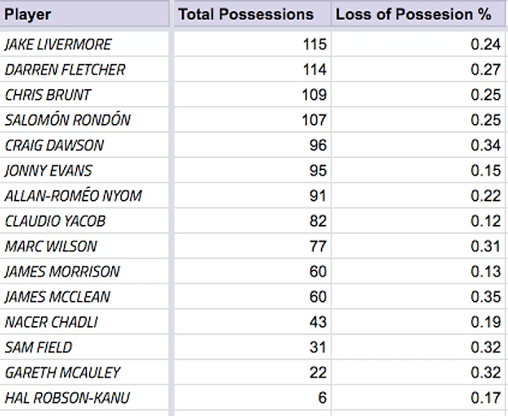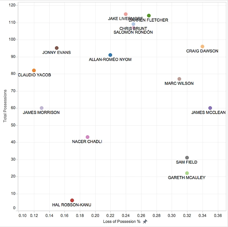 Чуть яснее. Крейг Доусон и Марк Уилсон – два парня, которые часто владеют мячом, но склонны его терять. Джеймс Макклейн – вингер, который тоже часто теряет мяч, но получает его чуть реже.