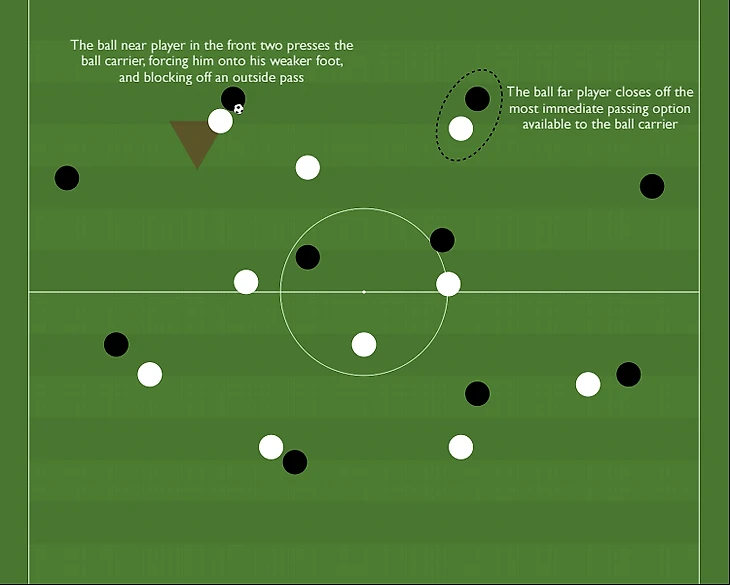 Левый форвард (которым может быть и не форвард, это условное обозначение) оказывает давление на защитника и закрывает оппонента у левой бровки. Правый – опекает второго центрального защитника.