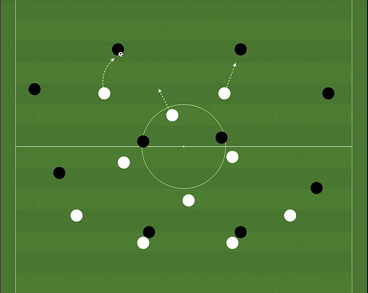 И вот, прессинг в 2-1-2 начался. Как и в хоккее, один нападающий оказывает давление на игрока, владеющего мячом, другой закрывает ближайшего защитника, третий закрывает центральную зону. Из центра он может поддержать атаку в случае успешного отбора/перехвата и сам включиться в прессинг, если оборонительное действие форварда не удалось.