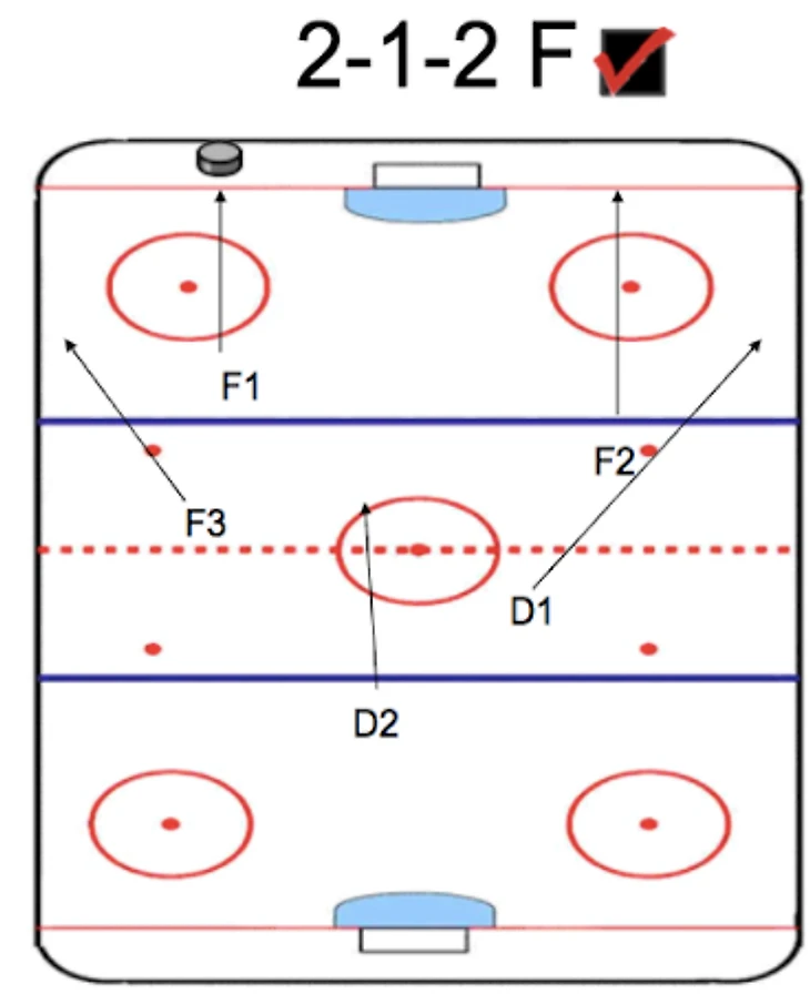Первый форвард (F1) интенсивно оказывает давление на владеющего шайбой. Второй форвард (F2) смещается в зону, куда шайба будет, по его мнению, переводиться в дальнейшем. F3 – защитник, который оказывает поддержку F1, закрывает зону в случае ошибки и может действовать как F2, если шайба полетела в его сторону. D1 и D2 оказывают поддержку из глубины, перемещаются ближе к бортикам или в центральной зоне, карауля проброс шайбы. На картинке всё очевиднее: