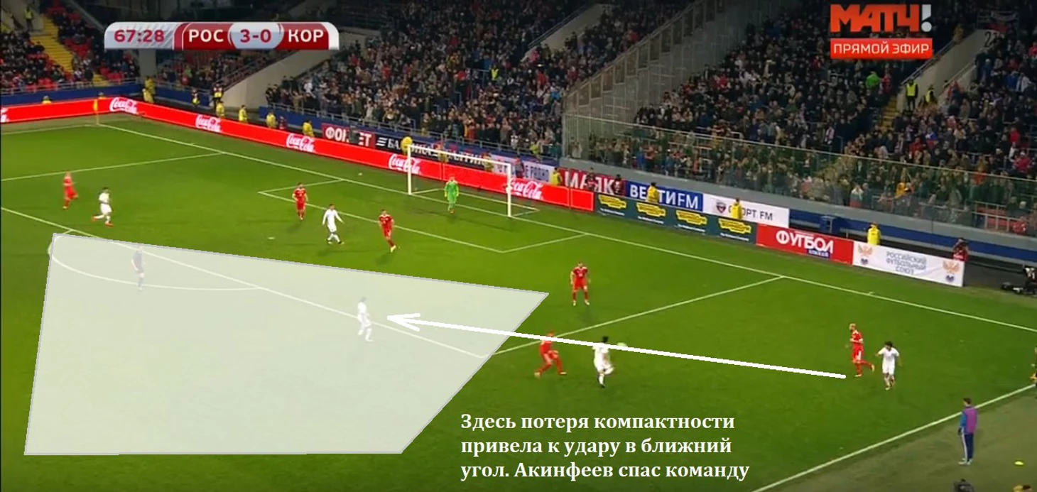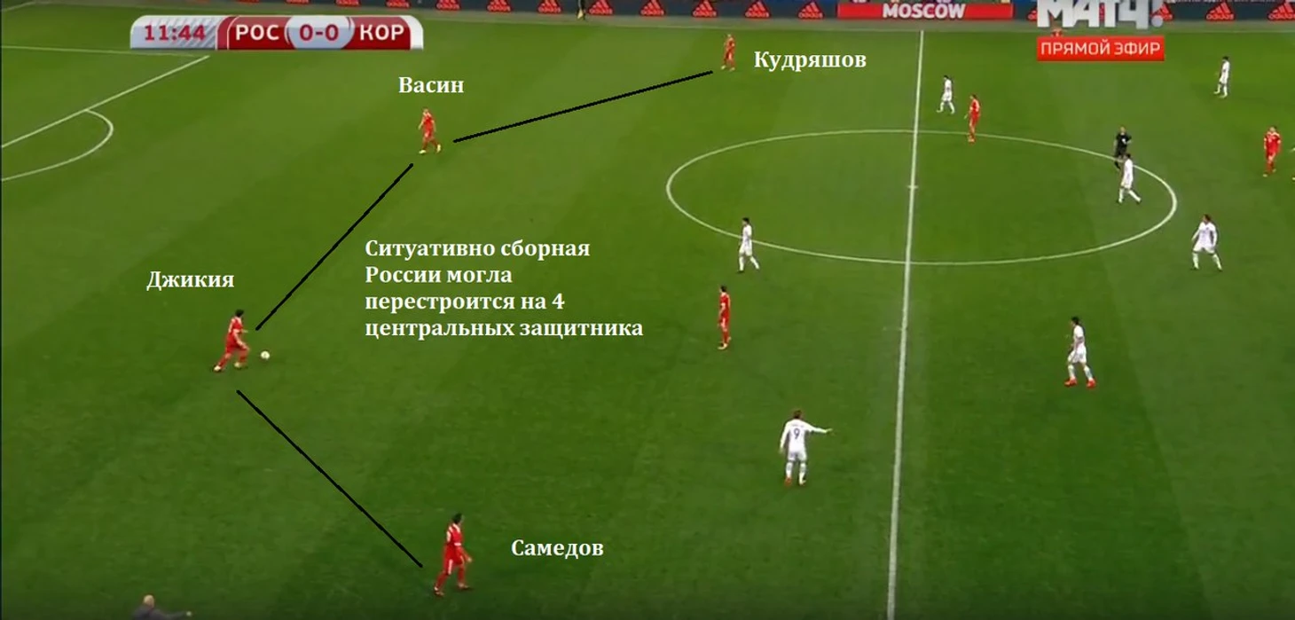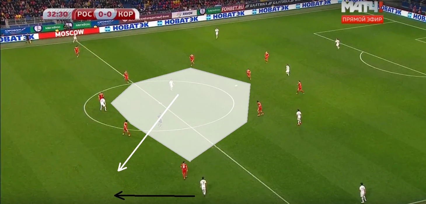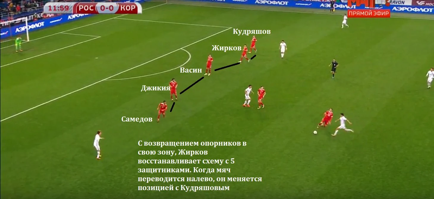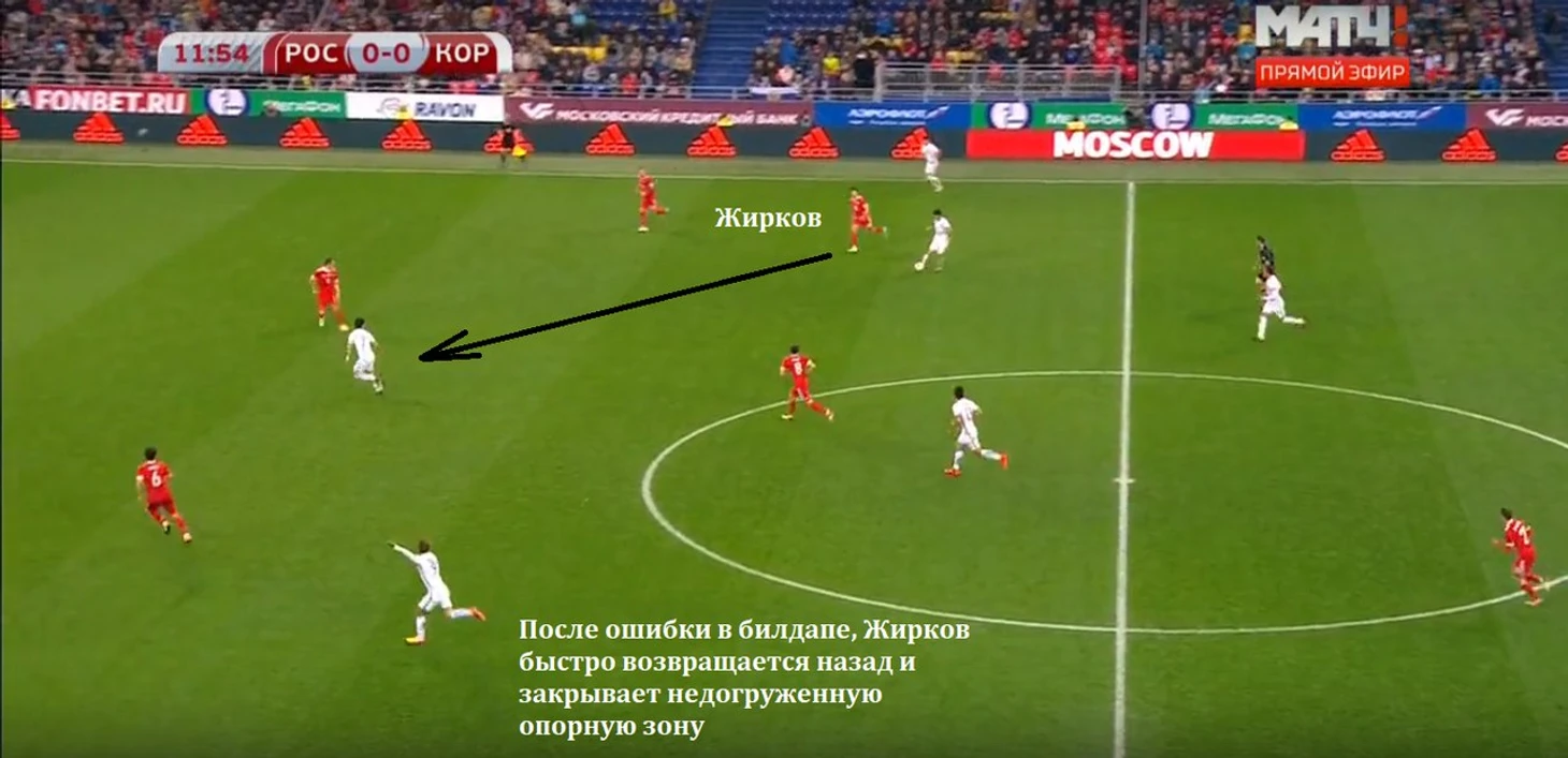 Поскольку Россия уже привыкла играть с тремя центральными защитниками, где все роли распределены, главной задачей было восстановить структуру линии обороны. Поэтому Жирков из опорной зоны смещается на позицию центрального защитника, несмотря на то, что Кудряшов был довольно близко. Когда опорники вернулись на место, а атака корейцев перешла на левый фланг, Жирков вернулся в свою зону.