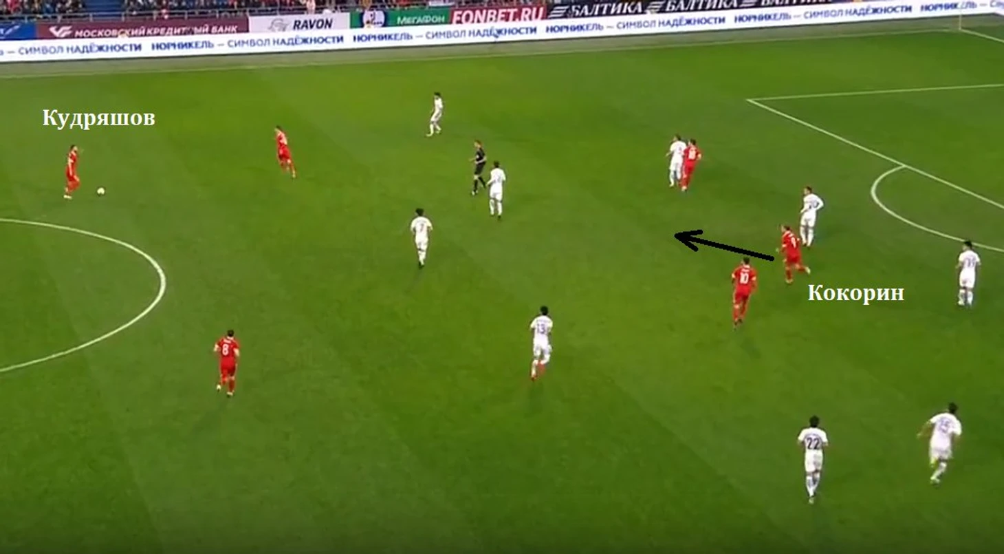 Затем Кокорин начинает резко забегать в штрафную. Кудряшов этот манёвр понял и вознаградил Александра передачей, но обработать мяч должным образом не получилось. Так Кокорин сам освободил для себя зону и по сути создал момент. Какое-то взаимодействие в атаке есть.