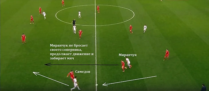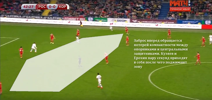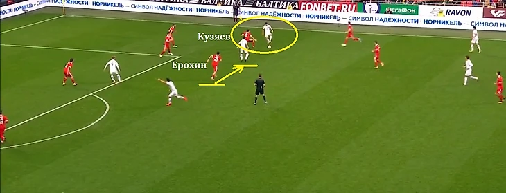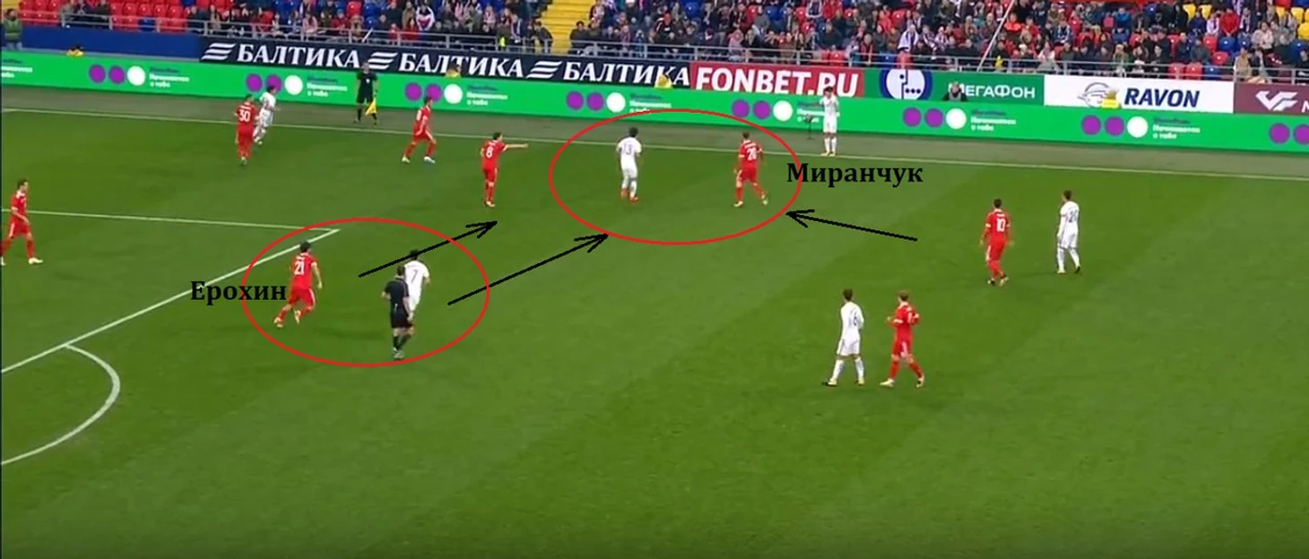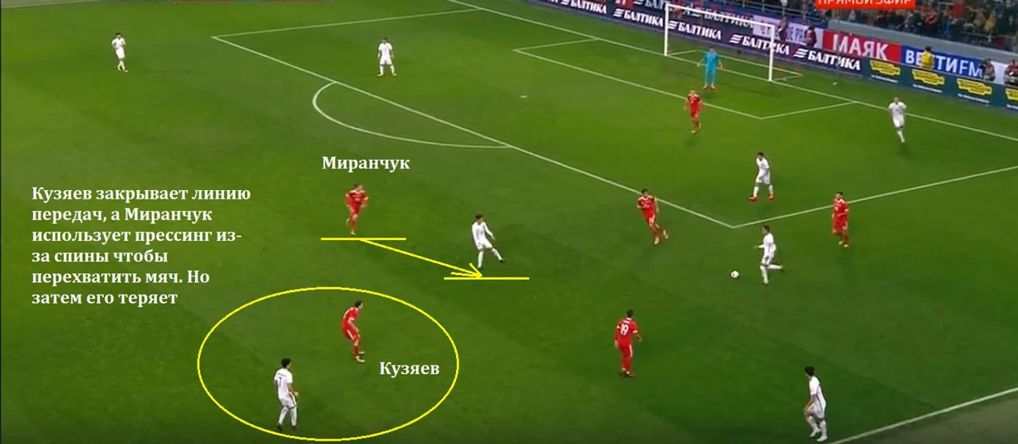 Акцент игры сместился направо. Кузяев, Ерохин и Миранчук поджимают зону и разделяют ответственность. Далер перекрывает линию передач, Ерохин следует за своим игроком, Миранчук мешает приёму мяча после аута.