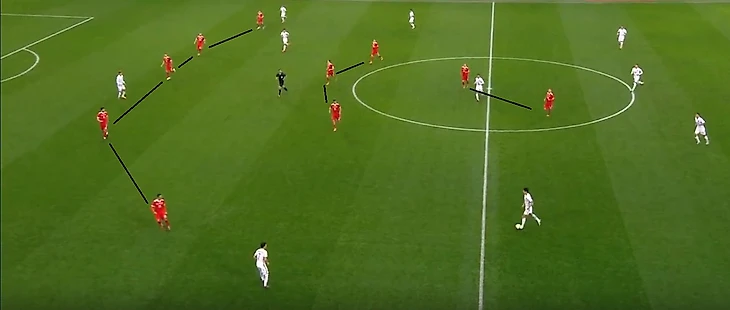 Здесь поджать зону должны центральные нападающие. Что они и сделали, но с некоторым опозданием. Непонятно хорошо это или плохо. Если футболисты смогут отобрать или перехватить мяч, то впереди необходимо оставить как можно больше игроков, чтобы провести контратаку. Если ошибка всё же случится, то недогруженная центральная зона приведёт к опасному моменту. Тут вопрос в установке тренера. Если команда собиралась играть с меньшим вниманием на оборону, то всё хорошо.