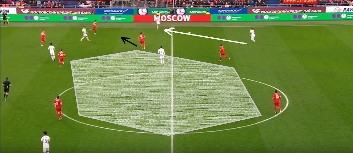 Иногда это приводило скорее не к проблемам, а к просто непривычной ситуации. Россия стремилась перегружать последнюю треть поля в позиционных атаках, из-за чего при потере в билдапе первая треть могла оказаться недогруженной. Вот небольшой пример.