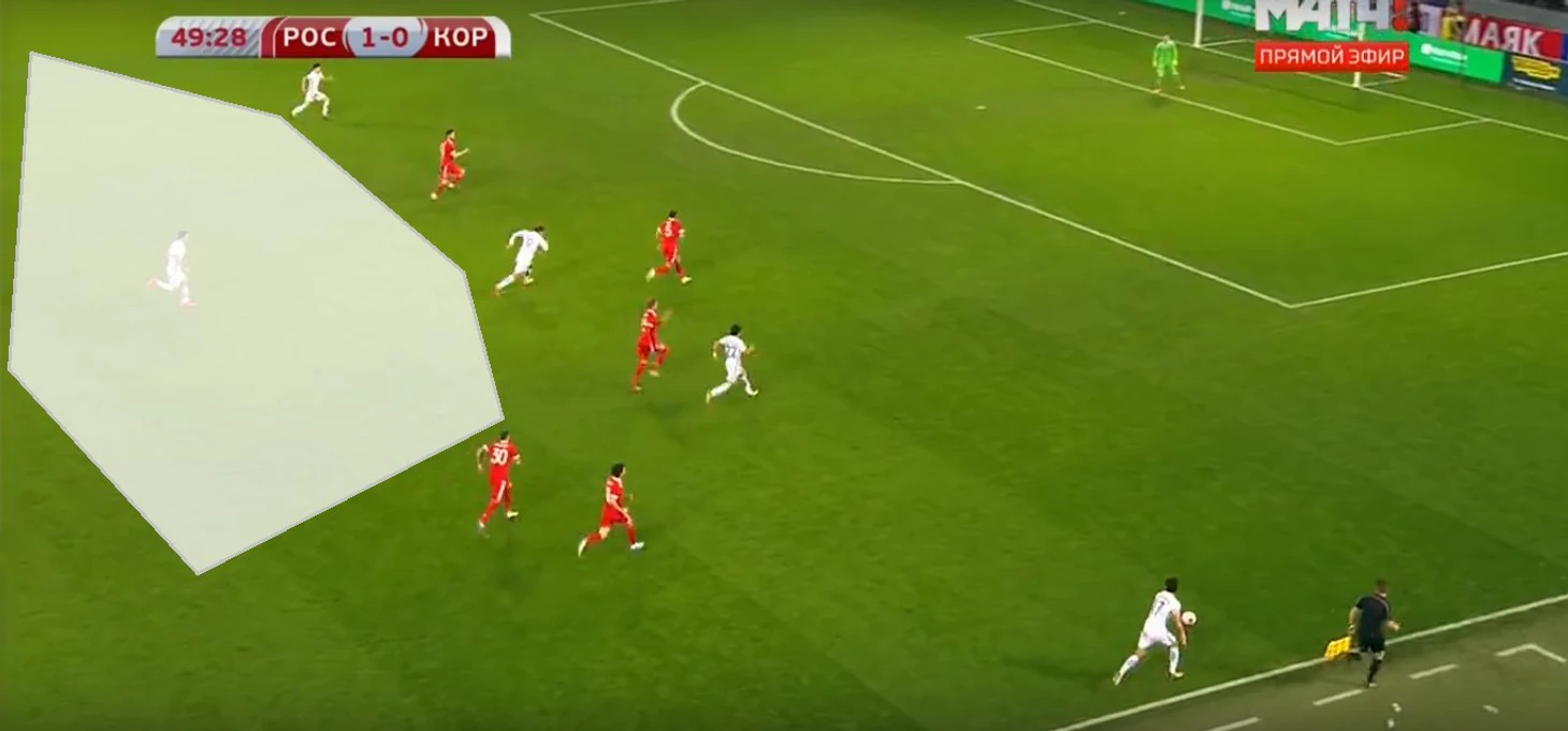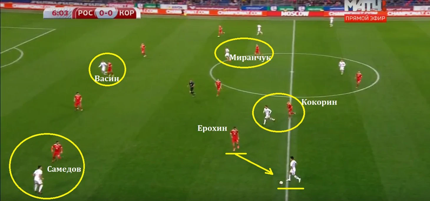 Кокорин медленно смещается в глубину. Центральный защитник корейцев замечает это и пытается помешать на возможном приёме. У гостей центральные защитники разделяются на двух блокировщиков и одного подстраховщика (тот что посередине). Этим знанием можно манипулировать.