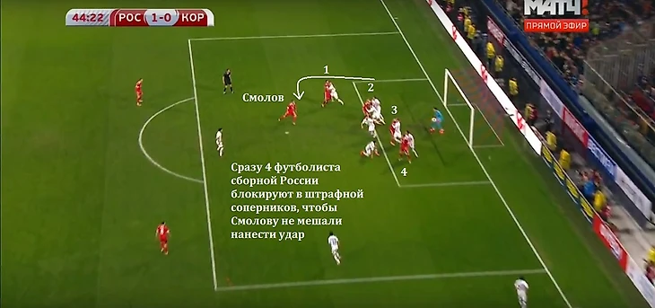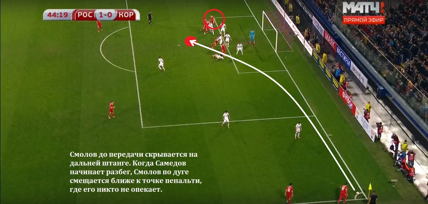 3 из 4 забитых мячей разбирать в рамках тактики не имеет смысла. 2 автогола (со стандарта и с игры), были вызваны ошибками корейцев, на которых нам мягко говоря пофиг. Да, действия футболистов сборной России привели к этим ошибкам, но доля удачи уж слишком высока. А вот первый гол со стандарта, который забил Смолов был интересен.