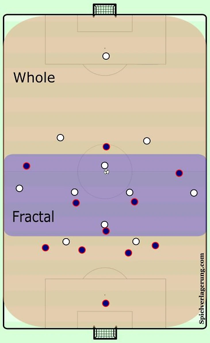 В случае, если упрощение допустимо, мы можем воспользоваться теорией фракталов. Редуцируемыми переменными в данном случае может быть количество футболистов, размер игровой зоны, время на упражнение, время отдыха между упражнениями, завершение эпизодов. Важно при этом сохранять хаотичность, сложность, ключевую цель, принятие решения, интенсивность и соответствие стилю игры.