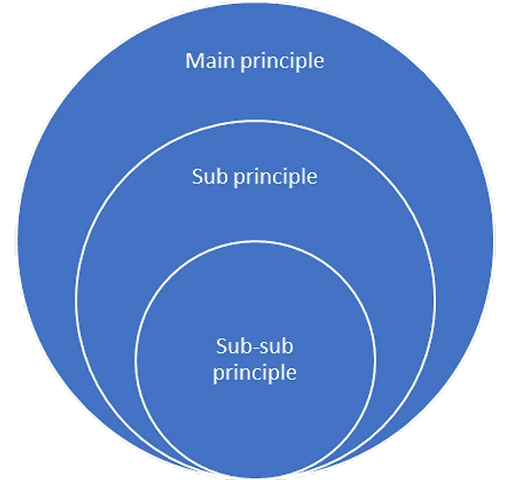 Они обычно разделяются на: основные принципы, подпринципы и микропринципы (в оригинале подподпринципы)