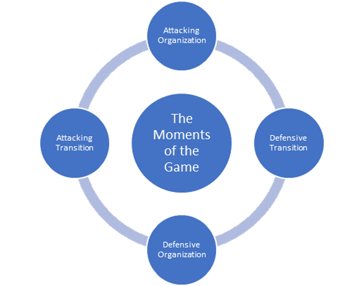 Существуют 4 фазы игры: атака, переход в оборону, оборона, переход в атаку. Важно понимать и определять когда происходит каждый из этих моментов, и взаимодействие моментов вашей команды с моментами у соперника.