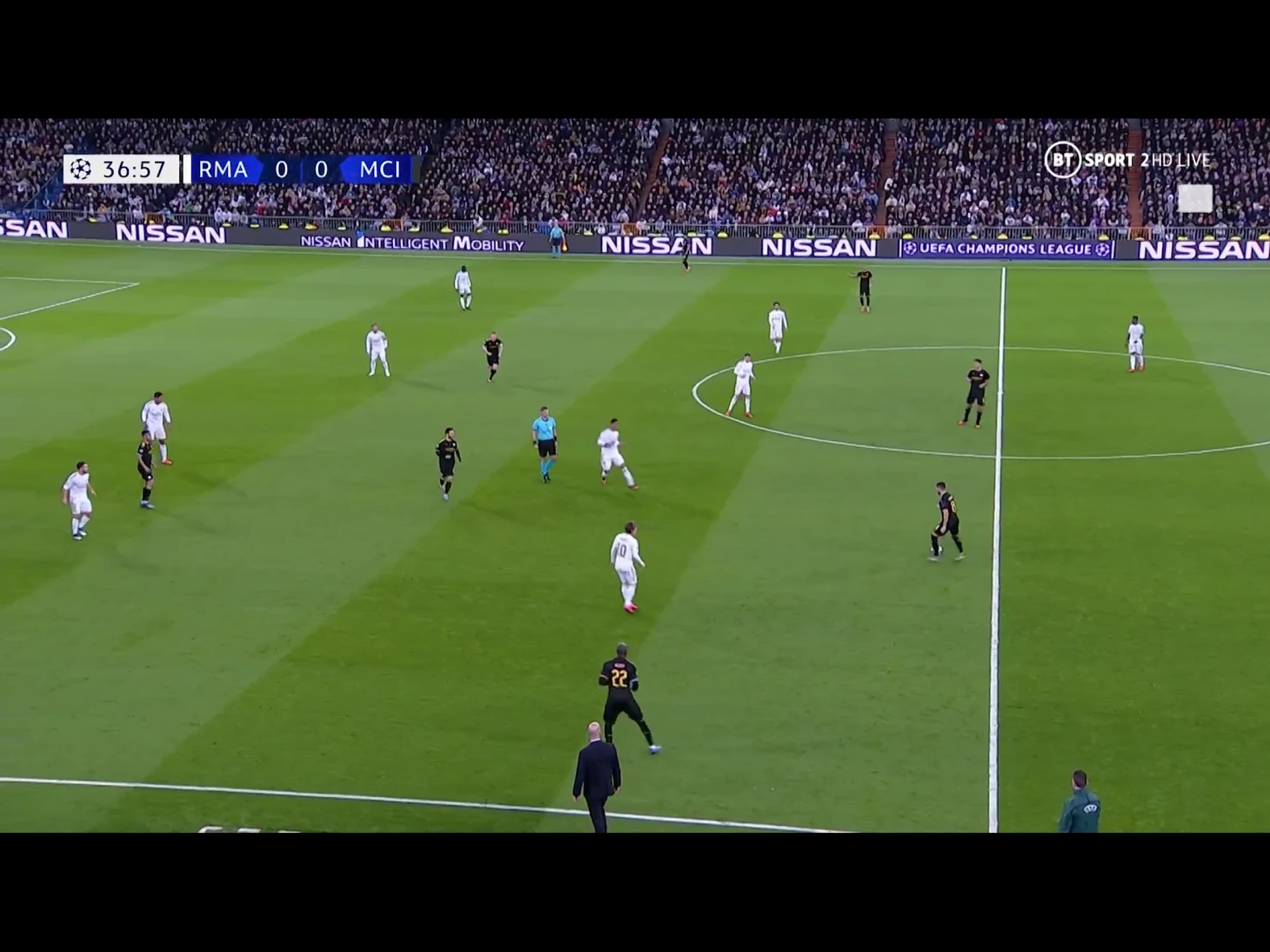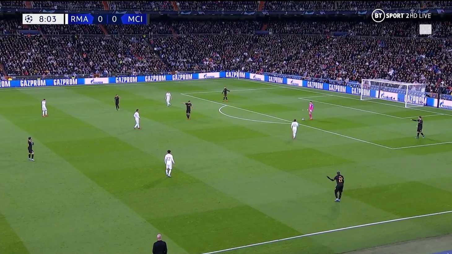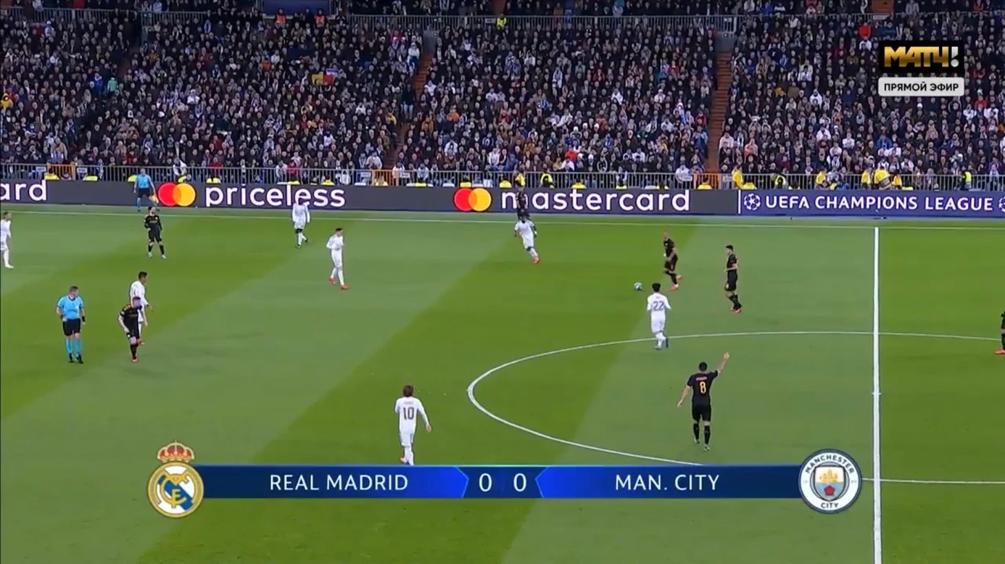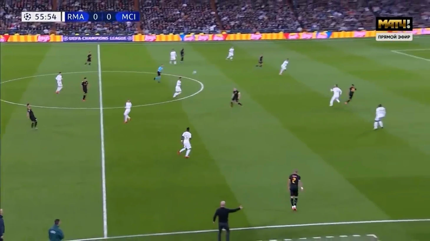 Очень равная игра с минимальным количеством опасных моментов. «Реал» хорошо удерживает мяч и прессингует, однако не может ничего из этого извлечь. «Сити» редко занимался своим любимым доминированием на чужой половине поля и играл в довольно осторожный для себя футбол, однако все равно был продуктивнее. Кроме того, на последней минуте гости могли вырваться вперед после подачи углового, однако Каземиро вынес мяч с ленточки ворот «Реала».