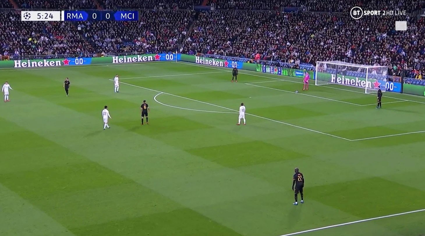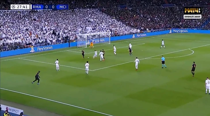 Как и говорил Гвардиола, «Сити» открыл поле. КДБ в полуфланге, его опекает Каземиро. Жезуса контролируют Рамос и Варан. Подавать смысла нет. Единственный игрок «Сити» в выигрышной позиции - Марез, который открывается перед штрафной.