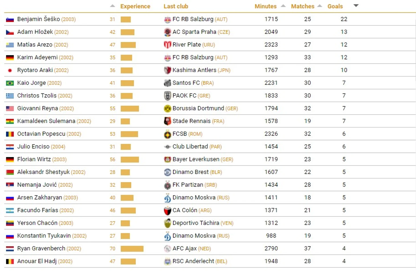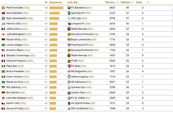 Если взять в расчёт чисто игровое время, то в поле зрения возникают Илья Забарный ("Динамо Киев"), Леонидас Стергиу ("Санкт-Галлен") и Фабрисио Диас ("Ливерпуль", Уругвай). Однако у них достаточно мало баллов опыта, что неудивительно с учётом силы их чемпионатов.