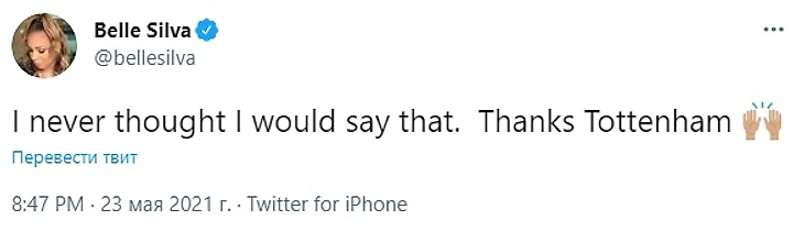 В воскресенье, узнав об этом, Изабель написала в твиттере: «Никогда не думала, что скажу это, но спасибо «Тоттенхэм».
