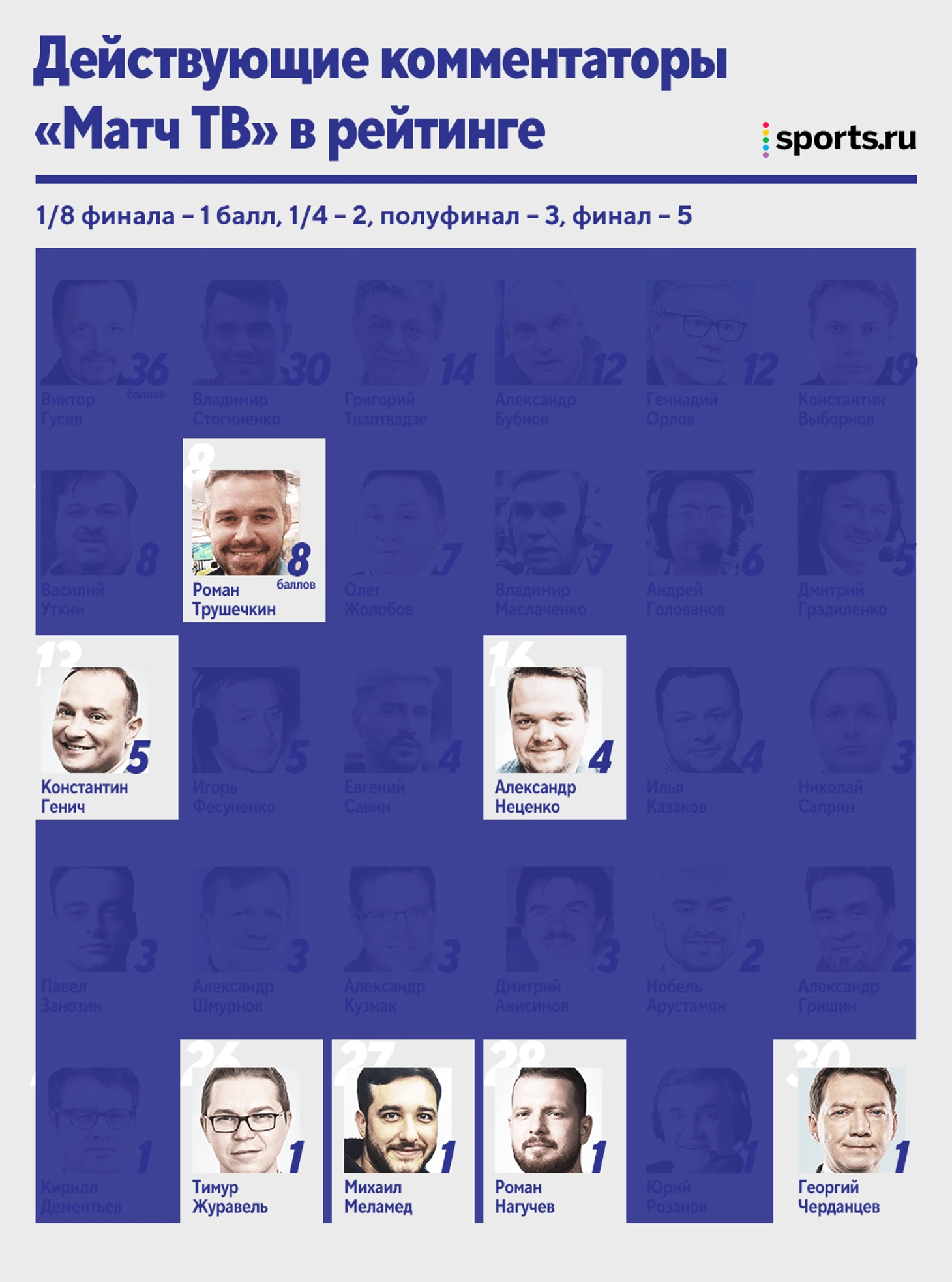 Еще мы сделали рейтинг комментаторов на основе их матчей в плей-офф. Формула проста: чем важнее матч, тем больше очков. За матч 1/8 финала начисляли 1 балл, за 1/4 – 2, за полуфинал – 3, за финал – 5 баллов. Делимся итогами!