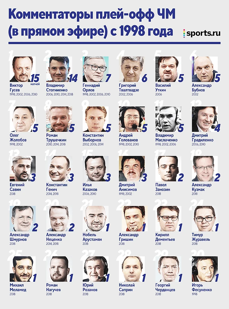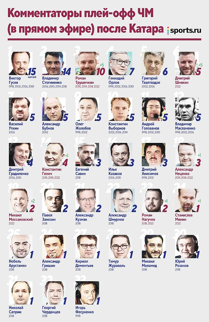 До плей-офф ЧМ-2022 мы выкладывали большой список комментаторов ЧМ с 1998 года (если пропустили, то вот). Пора обновить статистику.