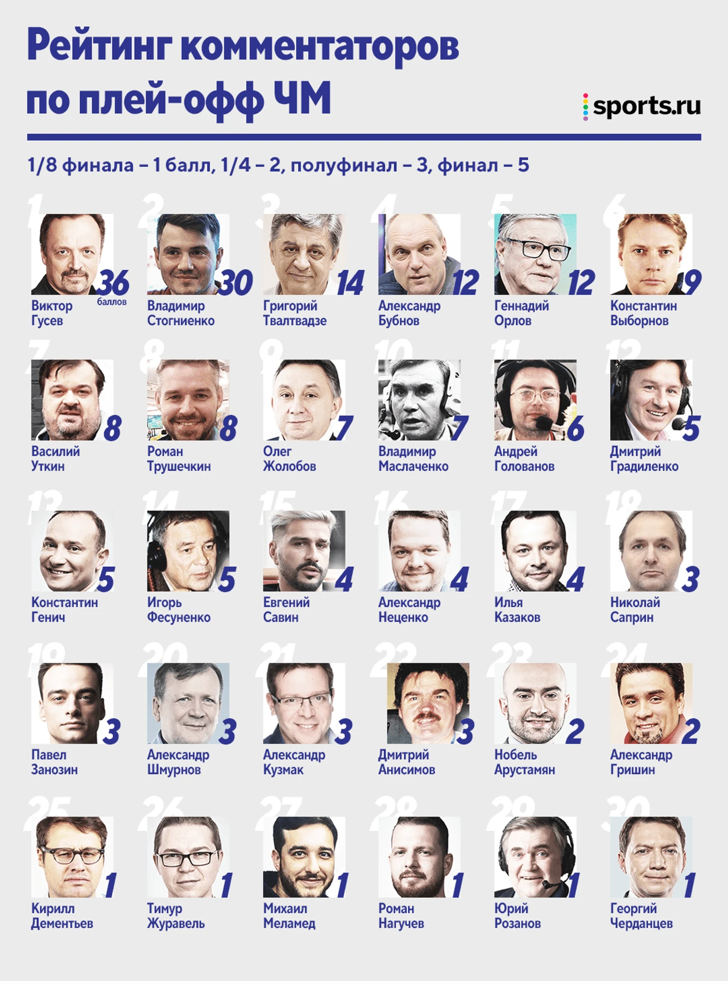 Первое важное уточнение: в зачет попадали только те, кто комментировали матчи в прямом эфире на федеральном канале. Условные комментаторы «Матч ТВ» и других площадок, чьи репортажи звучали в записи, в рейтинг не попали.