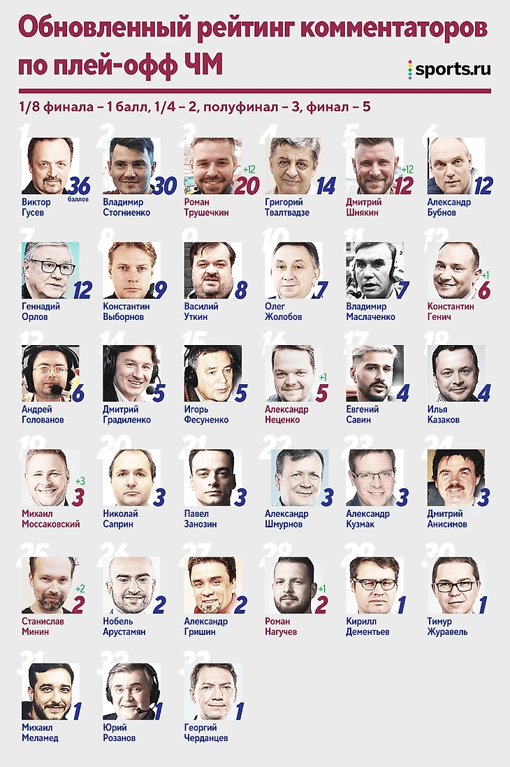 Трушечкин ворвался в топ-3, а Шнякин обогнал Уткина. Обновленный рейтинг комментаторов плей-офф ЧМ