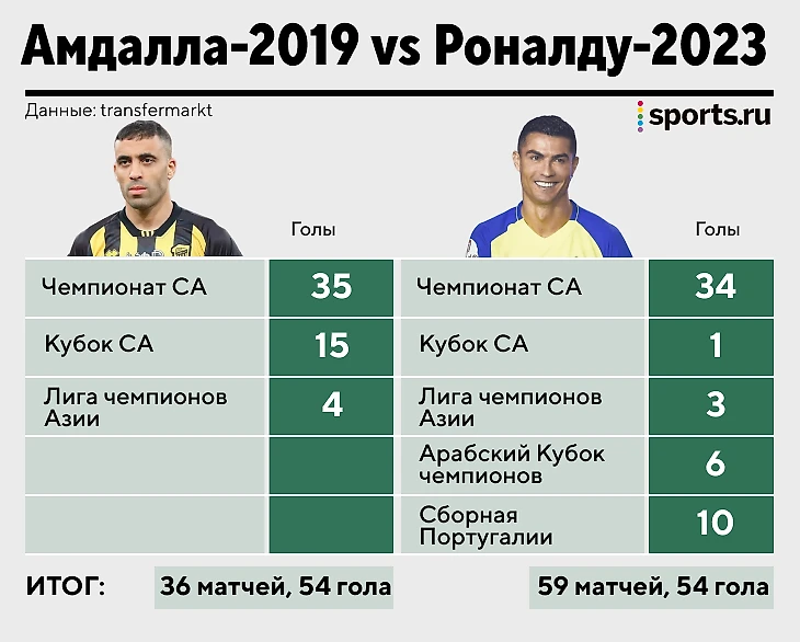 • Мы все внимательно пересчитали и скорее склоняемся к версии Transfermarkt: оба забили по 54 гола. Но у Амдаллы на 23 матча меньше!