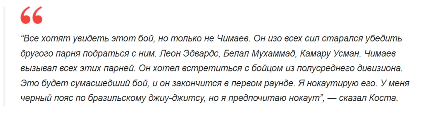 Бразилец уверен в своих силах и обещает нокаутировать Чимаева. В интервью MMA Junkie Коста отметил, что этот бой будет очень ожидаемым, и многие хотят увидеть его, за исключением самого Чимаева, который пытался вызвать других бойцов на драку. Коста утверждает, что этот поединок будет сумасшедшим и закончится в первом раунде, где он нокаутирует Чимаева. Хотя у Косты есть черный пояс по бразильскому джиу-джитсу, он предпочитает нокаут.