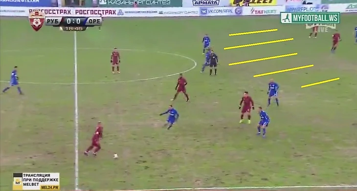 В отличие от «Анжи», команда Евдокимова не стала использовать высокий прессинг, и села глубоким оборонительным блоком к собственным воротам. Вся атакующая мысль оренбуржцев ушла в лонгболлы в направлении одинокого Дюриша - количество длинных пасов от общего числа передач «Оренбурга» составило 31%.