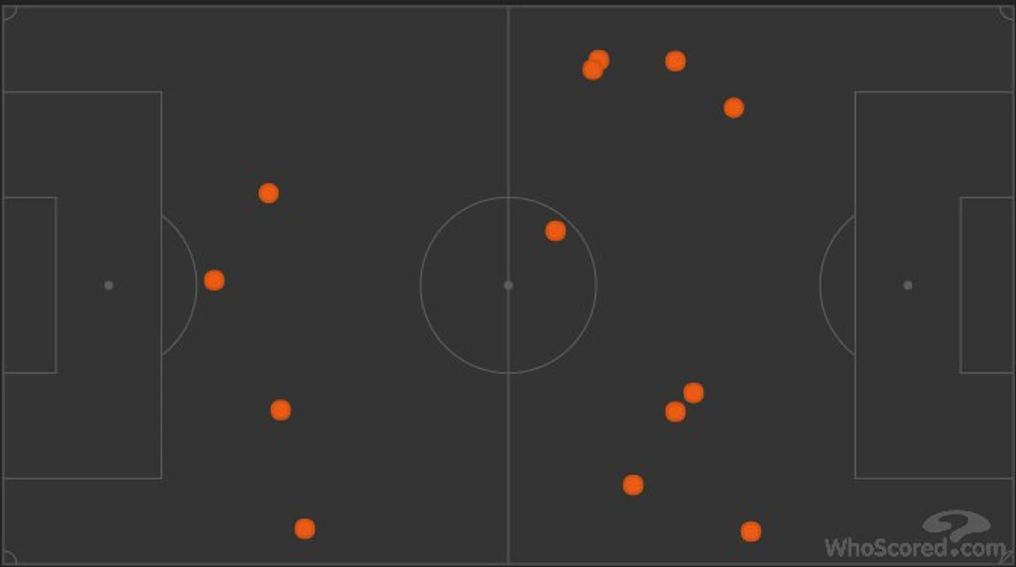 Карта успешных отборов «Рубина» за первый тайм. Большинство - на чужой половине поля.