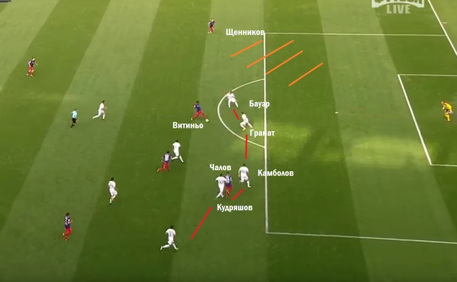 В минувшие выходные «ЦСКА» осознал: если не работают резкие длинные переводы в штрафную на Фернандеса - не работает ничего. «Армейцы» начали с верной установки – стягивать игроков на фланг и резко переводить мяч на противоположный, оставляя латераля один в один с соперником и пустым пространством вокруг.