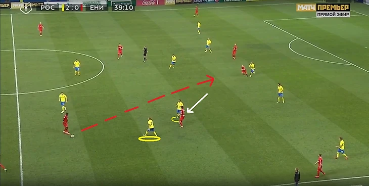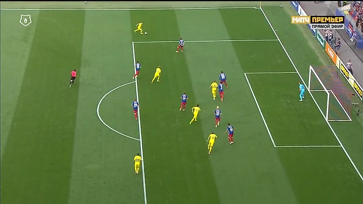 Крайний защитник (здесь – Скопинцев) обязательно выдвигается на линию с ЦЗ соперника. Часто такое расположение мешает позиционной структуре – абсолютно пустой центр и минимум вариантов для развития атаки.