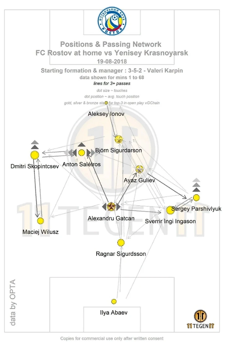 Главная черта «Ростова» в их построении – большая вовлеченность центральных защитников. «Ростов» не так часто владеет мячом (9-ый показатель в лиге) и совершает не так много передач (8 место в РПЛ). Однако сразу два игрока из ростовской команды в десятке самых пасующих футболистов лиги – Сигурдссон и Ингасон. Выше них только игроки команд первой четверки по владению.