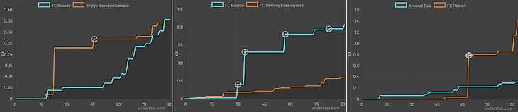 Timing chart xG последних трех матчей «Ростова»