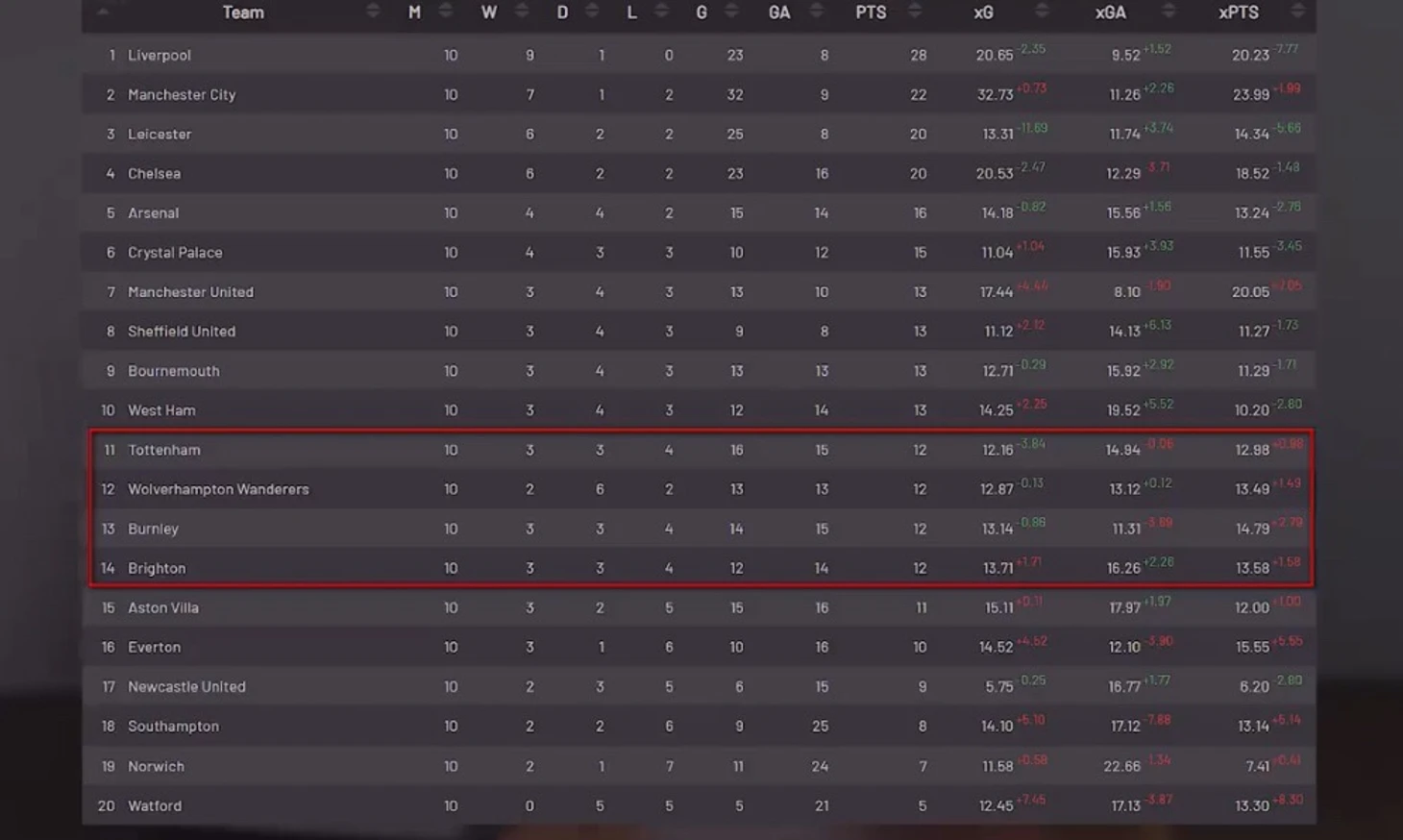 Но проблема отсутствия качественного правого защитника не единственная у «Тоттенхэма» на данный момент. По сравнению с прошлыми сезонами у «шпор» просела результативность. Согласно данным с Instat.com, если в сезоне 18/19 после 10 туров «Тоттенхэм» забил те же 16 голов, что и сейчас, но при этом имел показатель в 20 xG, то в этом сезоне подопечные Почеттино имеют в активе лишь 12 xG. Иными словами, «Тоттенхэм» заслуженно занимает своё 11-е место.