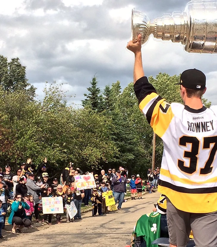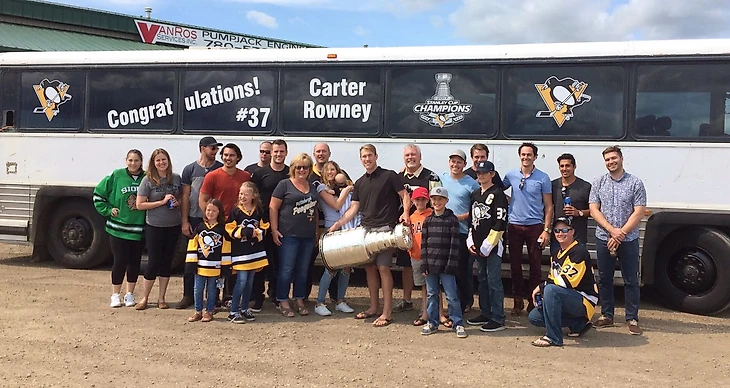 Картер Роуни выбрал автобусное путешествие с кубком из родного Гранд-Прери до Секссмита, чтобы поцеловать его на глазах фанатов.