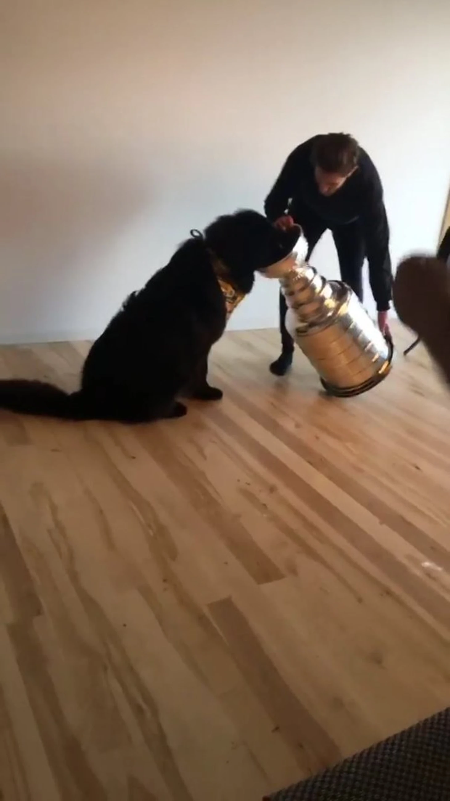 Голкипер Мэтт Мюррей решил продолжить знакомство трофея с фауной, а потому его пес поел оттуда, откуда все хоккеисты пьют шампанское после сирены последнего матча финала.