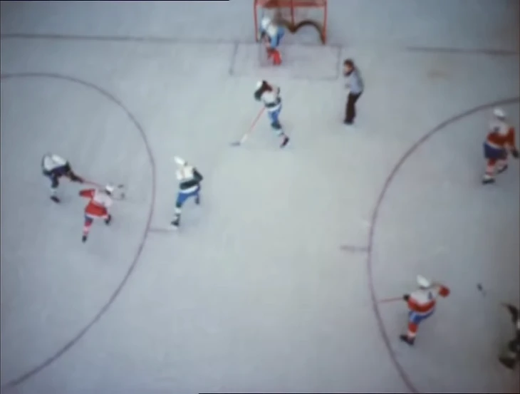 Следующее появление на льду тройки Гусева приводит к опасному моменту – Электроник убегает один на один. Он бросает по центру ворот – но все летит в щитки голкиперу, который даже снимает маску и заливается смехом. «Идет по кратчайшему пути», – объясняет профессор Виктор Громов. Однако по своим воротам он бросал точно под штангу!