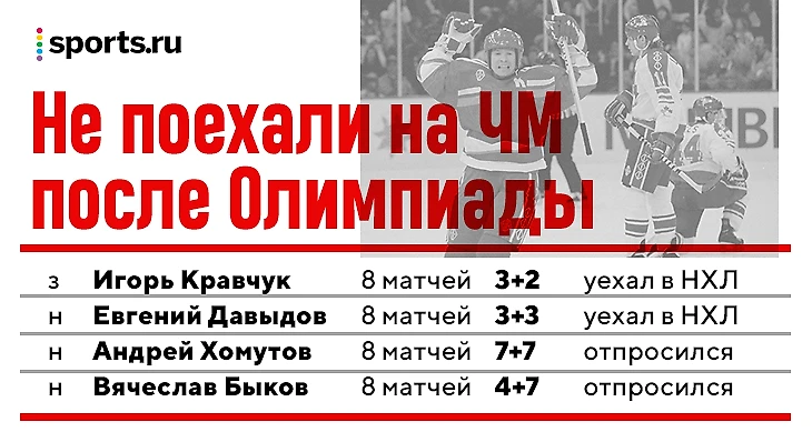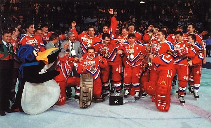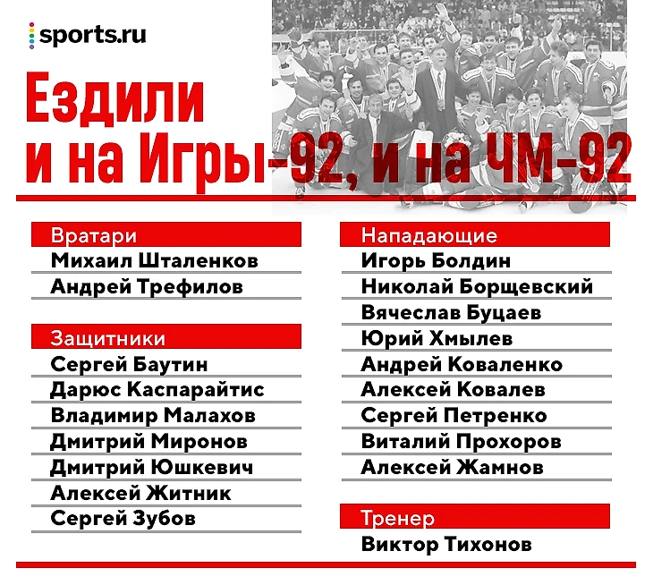 Парадокс в том, что эта же самая команда – но в статусе объединенной, без флага и гимна – за два месяца до ЧМ-1992 взяла золото Альбервиля. Серьезно, 18 из 22 игроков – свежие олимпийские чемпионы: оба вратаря, почти вся оборона и три тройки нападения.