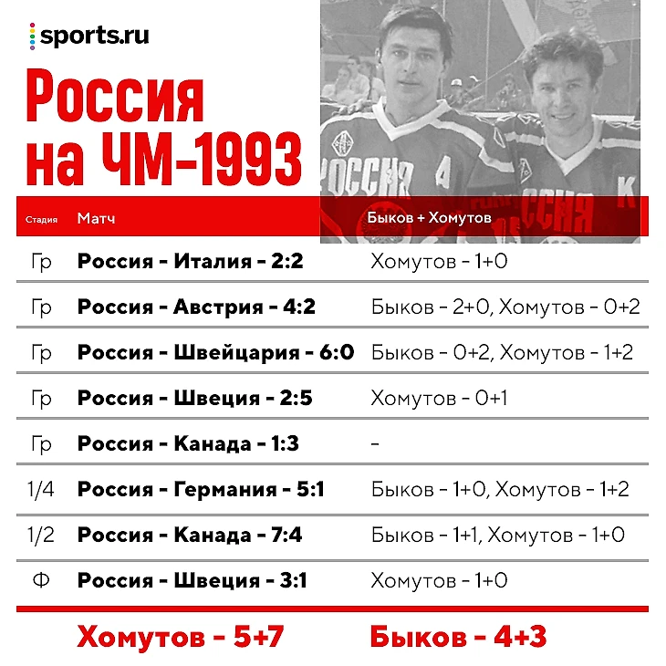 Забавно, что когда любого игрока той сборной спрашивают про тот турнир – они все в одни голос говорят, что команду затащили именно два старших товарища. Вот так отвечает, например, Алексей Яшин: «На ЧМ-93 в сборную России мало кто верил. Но там Вячеслав Быков с Андреем Хомутовым все сделали. Быстро вписались в команду, очень здорово сыграли и вытащили нас на первое место».