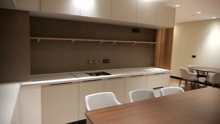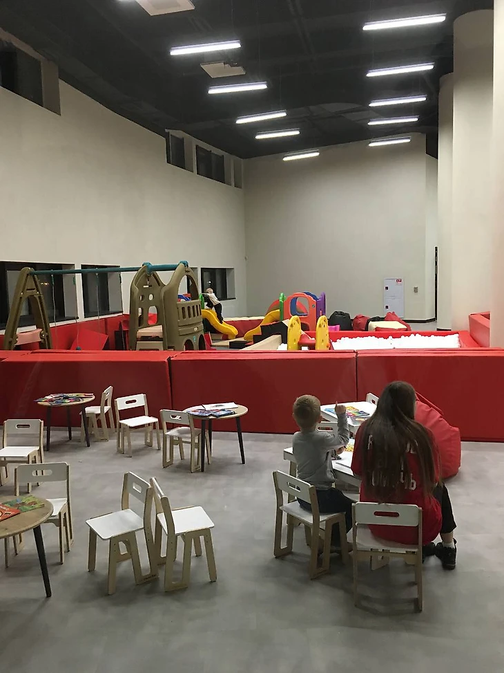 Для семей хоккеистов есть отдельная комната со столами, кухонной и детской зонами.