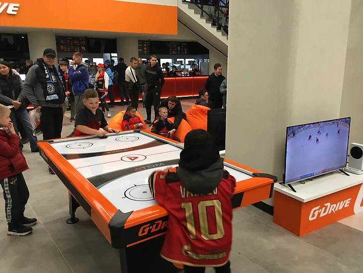 Помимо еды, пива и покупок для болельщиков здесь еще море развлечений. Например, настольный хоккей.
