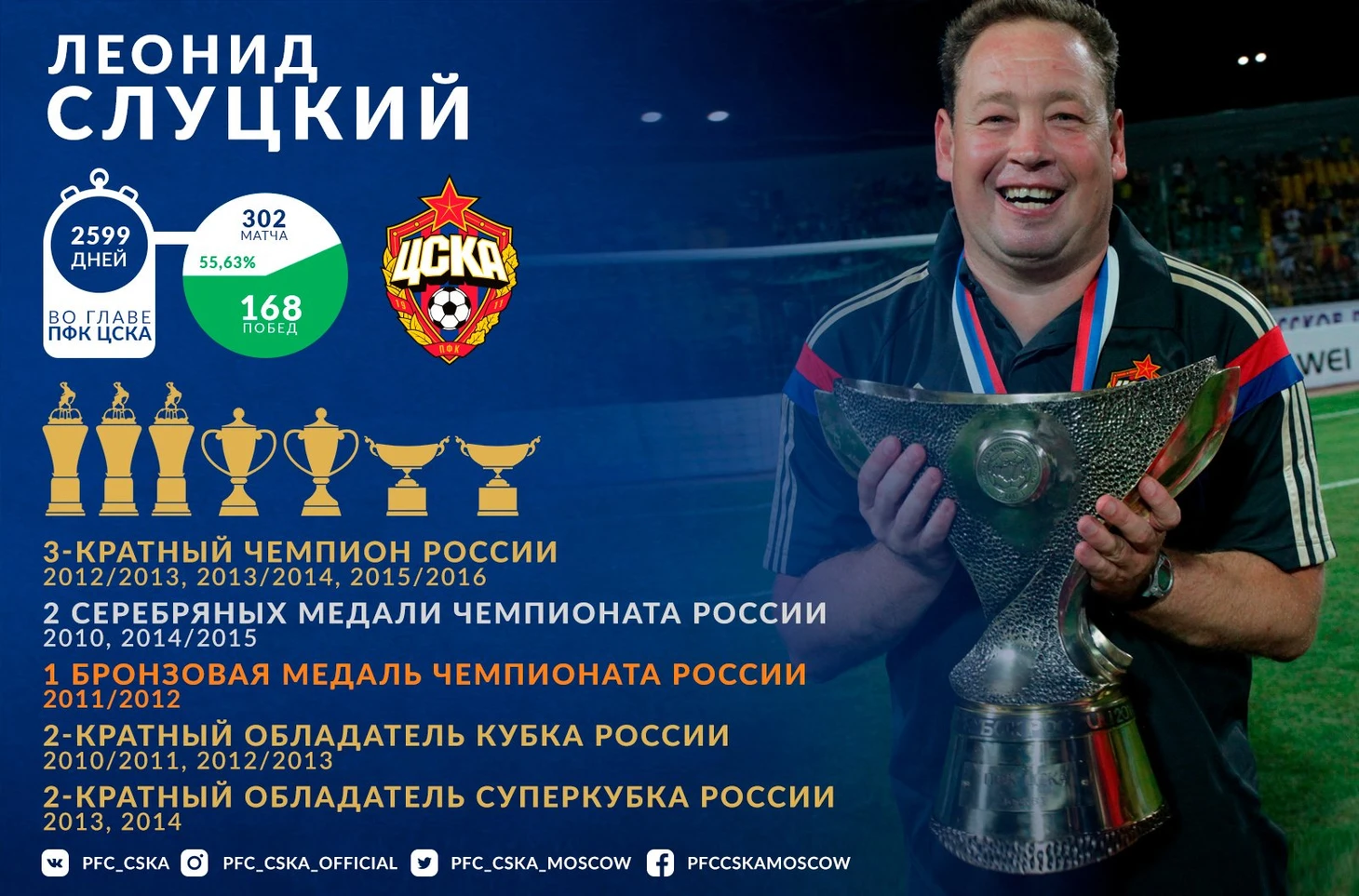 За время в ЦСКА Слуцкий выиграл 3 чемпионства, 2 Кубка и 2 Суперкубка страны. Уже во втором своём матче на посту главного тренера сыграл легендарную и обидную ничью на выезде с «Манчестер Юнайтед» (3:3), выводил в том сезоне армейцев в ¼ финала ЛЧ (лучший показатель среди российских клубов). В разное время обыгрывал «Интер» (2:1 на выезде), «Манчестер Сити» (2:1 на выезде), играл вничью с «Реалом» и «Ромой» (оба матча дома 1:1)