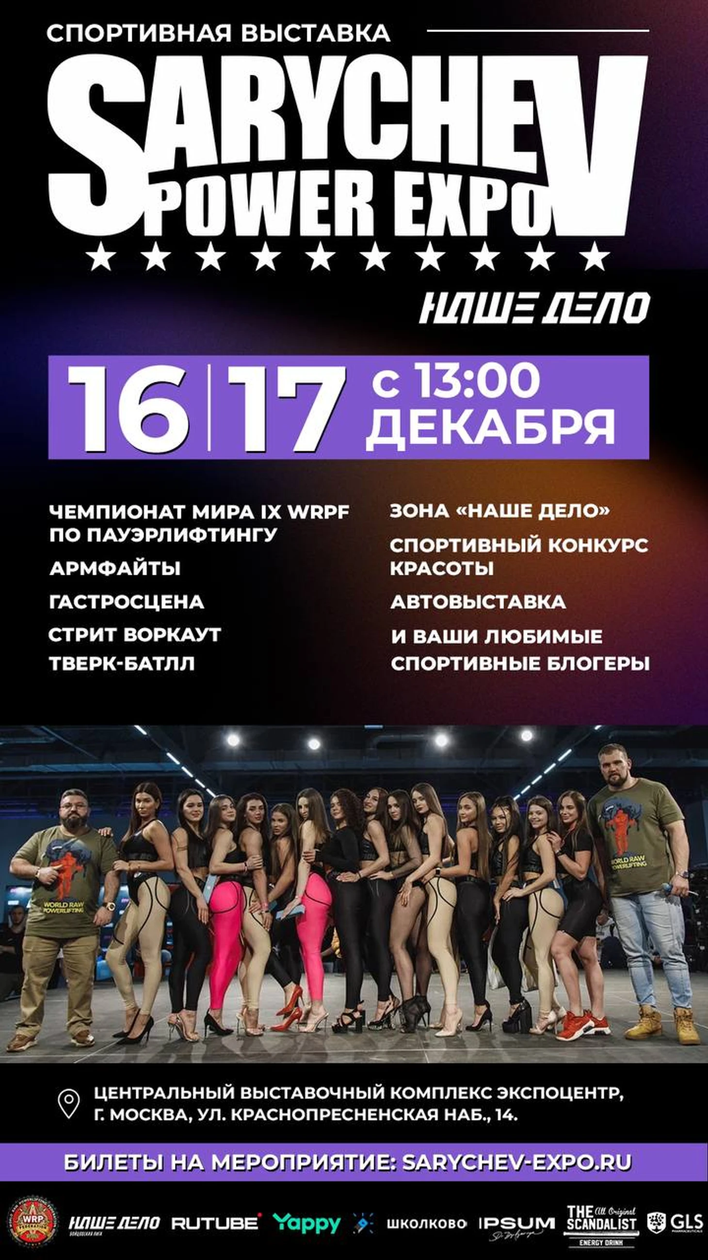16–17 декабря в Москве стартует спортивный фестиваль «SARYCHEV POWER EXPO & Наше Дело», в рамках которого пройдет чемпионат Мира по пауэрлифтингу силовому двоеборью, жиму лежа, армрестлингу. Гостям мероприятия будут доступно множество интерактивных, развлекательно-спортивных зон.