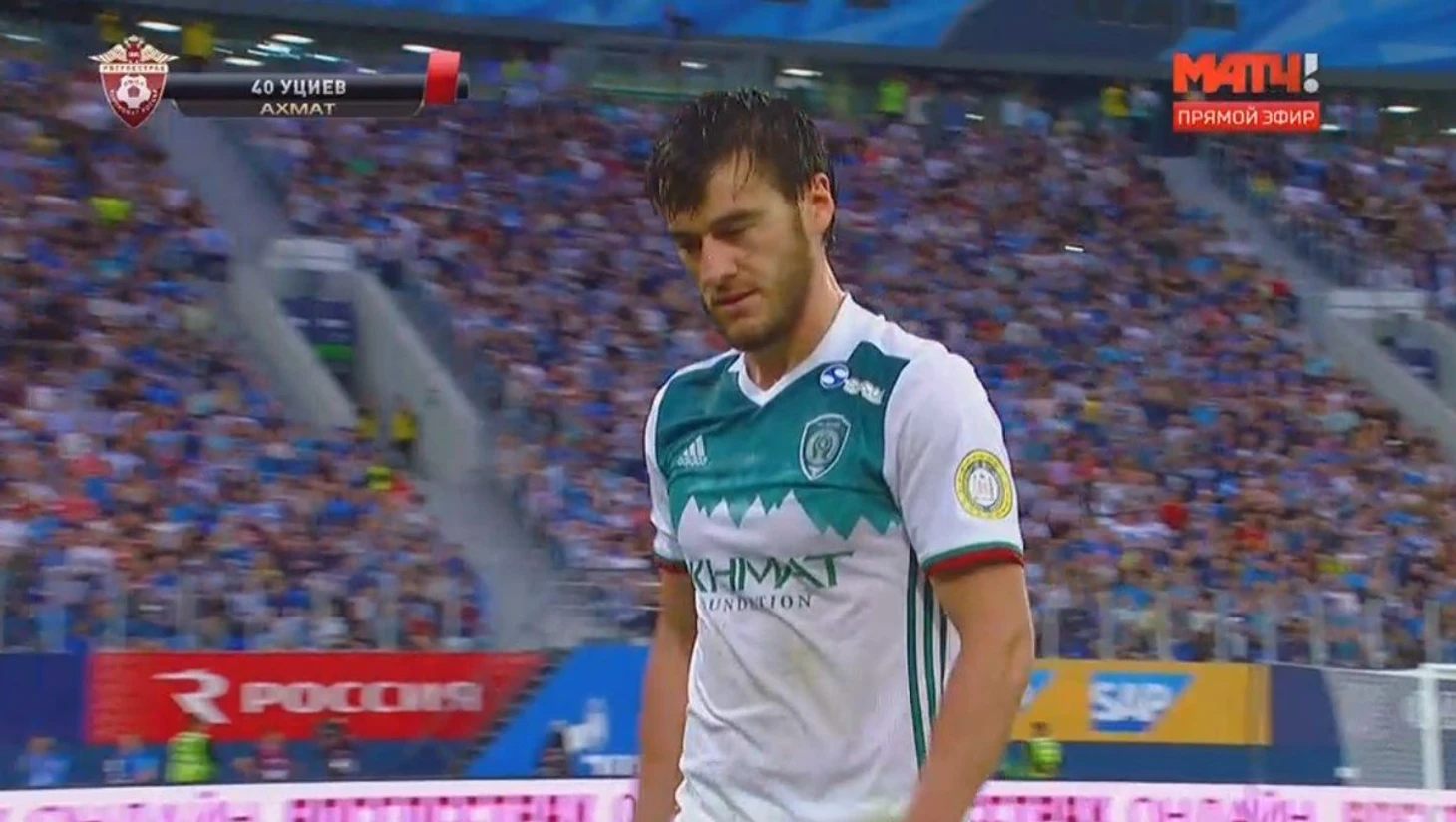 Уже на 29-й минуте заработал удаление Ризван Уциев (Ахмат). За две минуты до этого он в толкучке обменялся ударами с Кришито (первая желтая), затем упал после единоборства с ним и побежал отрывать Доменико ногу.