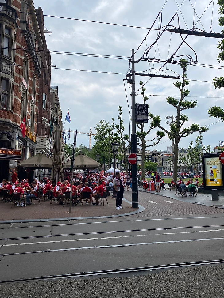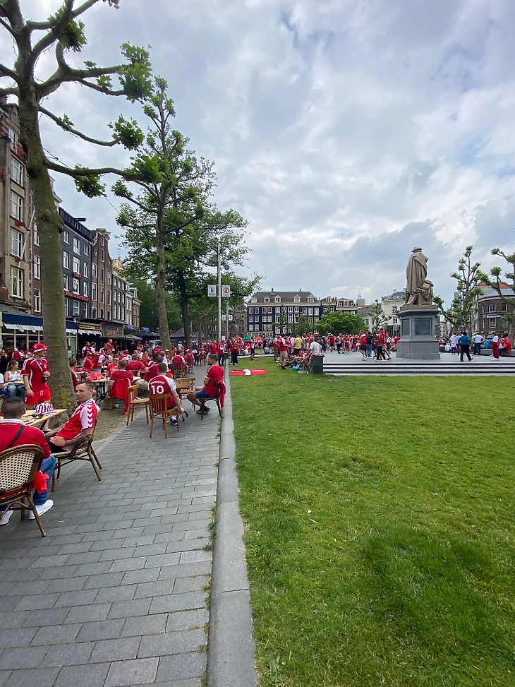 Название этого текста уже дает понять, что поход на этот матч получился необычным. Однако пойдем по порядку и начнем с центра города утром и днем. Датские фанаты создали непередаваемую атмосферу: центр города был красно-белым. Особенно впечатляла атмосфера на площади Рембрандта. Датские фанаты собрались там, пели песня, пили пиво, танцевали, веселились.