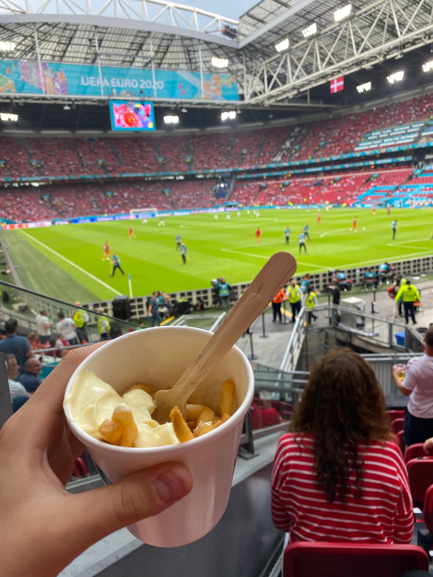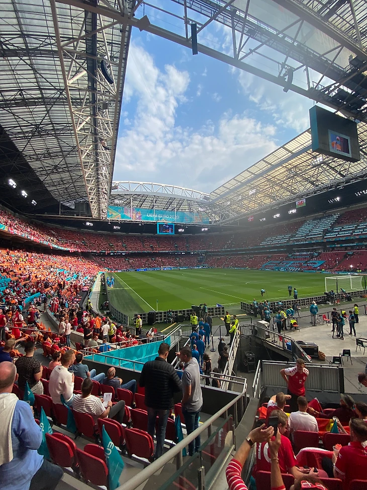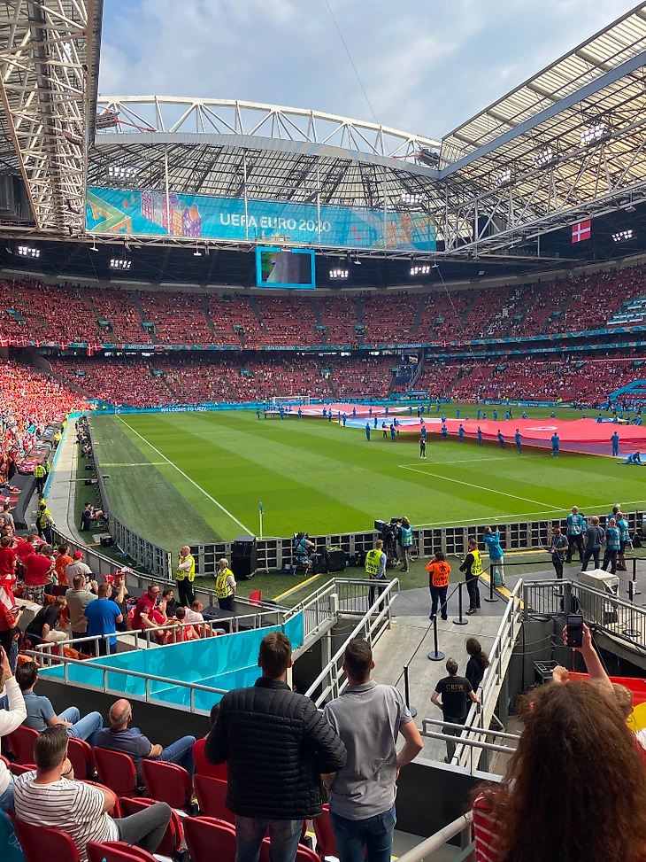 Далее я пошел на стадион, места, на удивление, оказались очень хорошими. В очереди за едой и напитками удалось поговорить с датчанами, которые так же сформировали мнение о сборной России. Мы сошлись во мнении. На стадионе, как и в центре города, были в основном датчане. Проскальзывали Валлийские флаги и футболки, а также голландская атрибутика, но большинство было красно-белым. Оно так же пело, пило и танцевало. В течение всего матча.