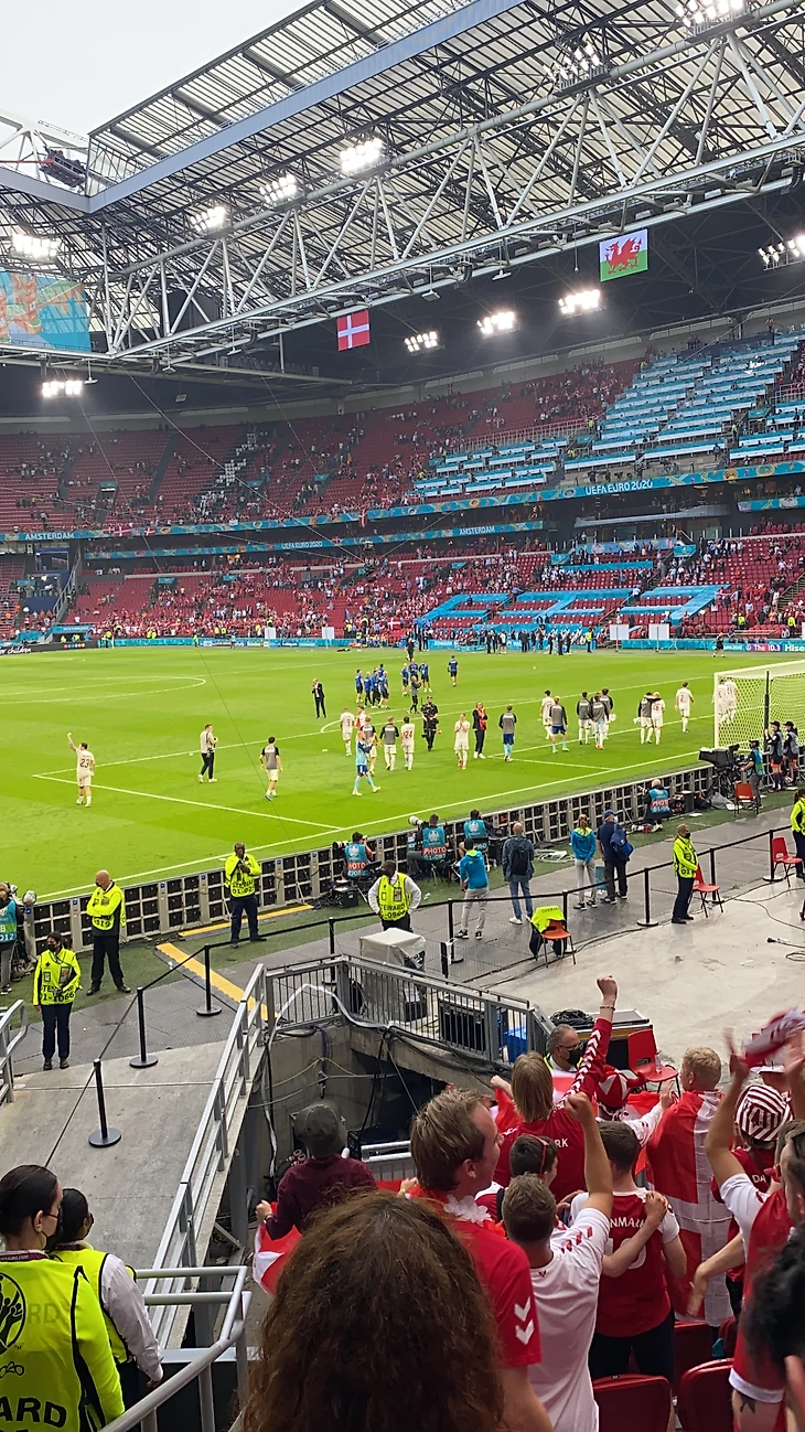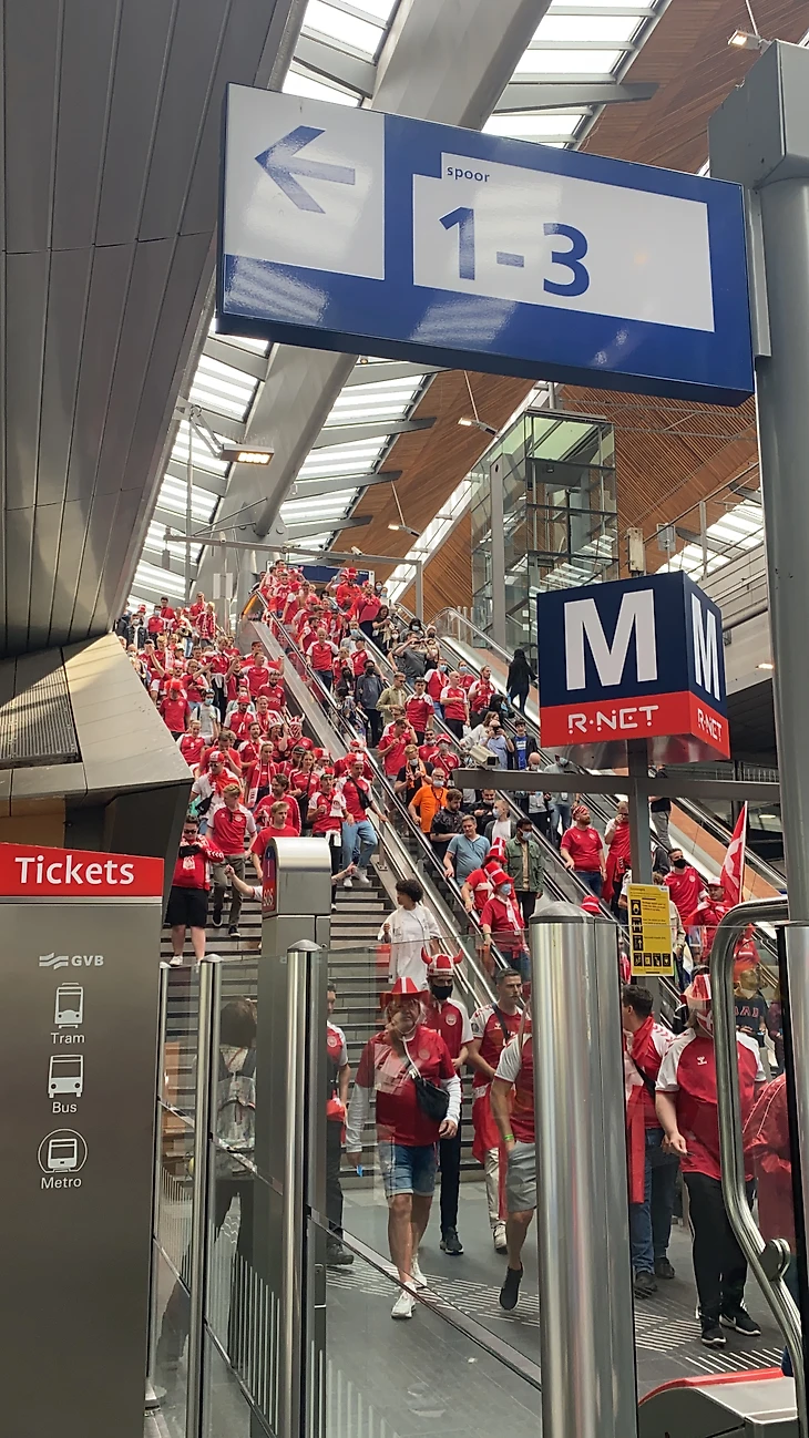 Валлийские фанаты тоже были видно, однако их было значительно меньше. Поезд до Амстердам Арены был полностью заполнен Датскими фанатами. Как и на площади Рембрандта, они пели и пили. Я видел много фанатов в течение ЧМ-2018 и ЧЕ 2020, но эти ребята запомнились мне больше всего.