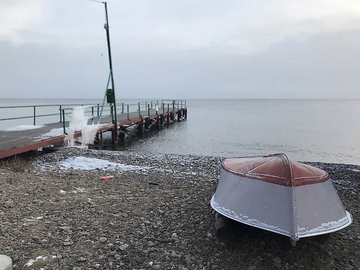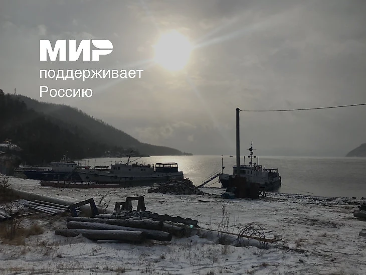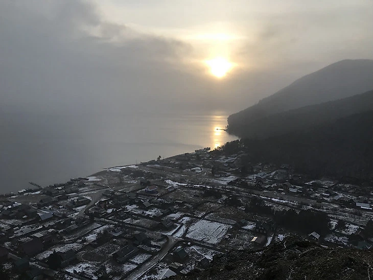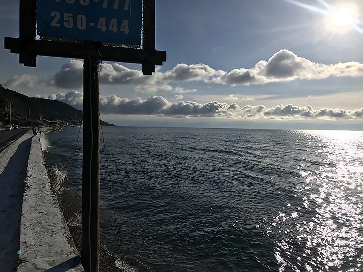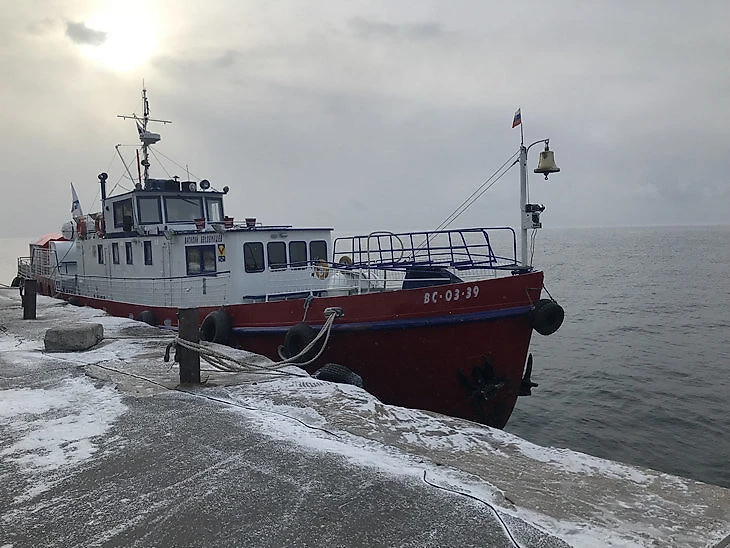 На подъезде к причалу мы остановились там, где Ангара выходит из Байкала. Скованная утренним туманом и первыми льдинками вода нежно трогала берега и облепленные снегом ели, белоснежные подушки блестели на крышах домов на другой стороне. В таких местах мечтаешь встретить Новый год и сбить лыжной палкой снег с дерева. На улице – минус 15. Солнце – нечеткий желтый шар. Снег выпал две недели назад.