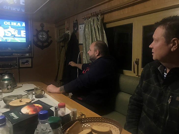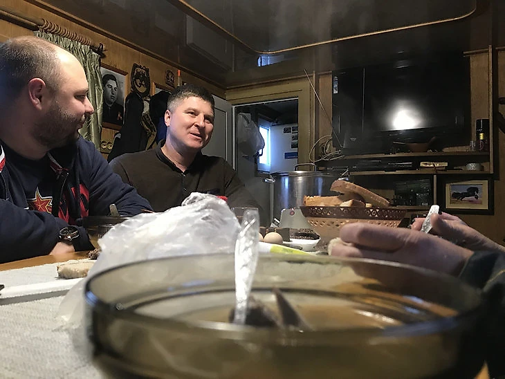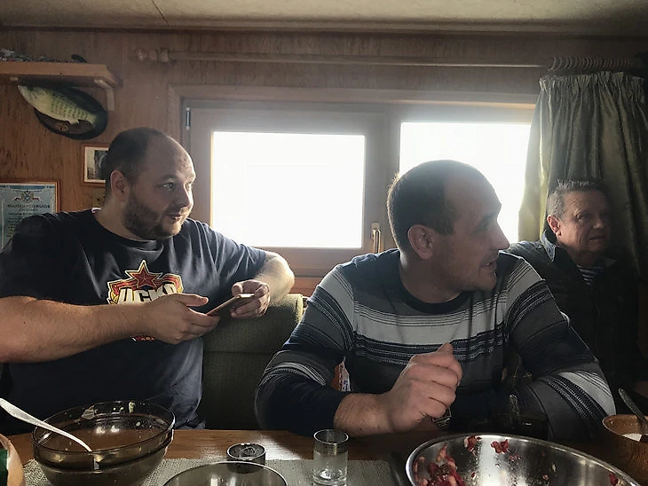 При входе на катер страхует капитан Павел. В его рубке рядом со штурвалом написана морская молитва, есть крохотный значок в виде флага СССР, бинокли, фуражка, книги, иконы. В каюте-гостиной, где мы обедаем и смотрим футбол, висит Николай Чудотворец (покровитель в том числе и моряков), фотографии дедов и отца Дмитрия.