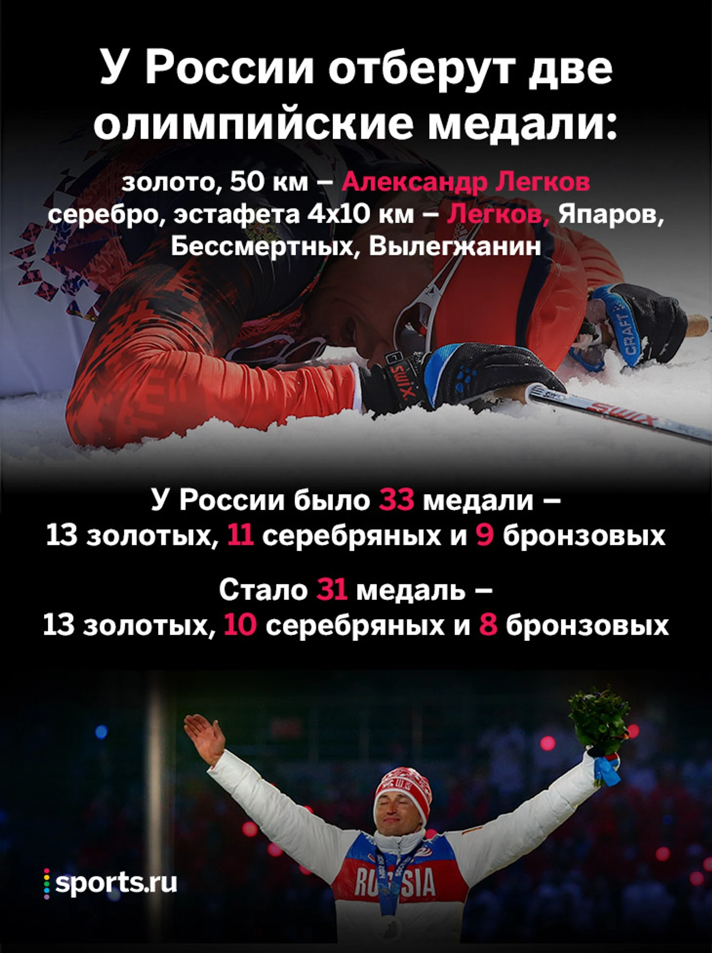 Таким образом, Россия лишена двух медалей – золота Легкова в марафоне и серебра в мужской эстафете. Олимпийскому комитету России предписано обеспечить скорейшее возвращение этих медалей (а еще дипломов и призовых выплат) в МОК.