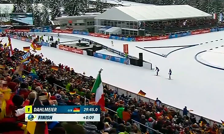 Вирер выронила палку и, по инерции работая обеими руками, из последних сил покатила к финишу. Домрачева, увидев потерю, подчеркнуто опустила руки и прекратила борьбу – итальянская публика точно оценила красивый жест Дарьи.
