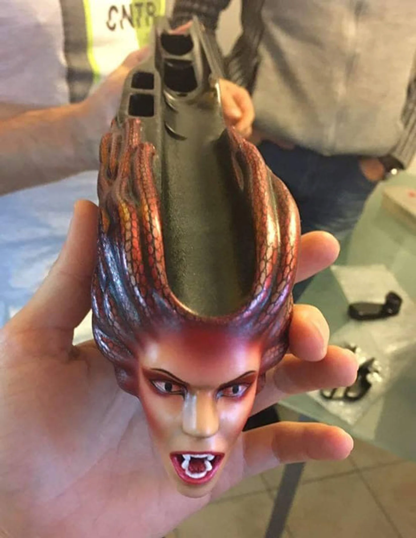 Марии понравилась идея ложа с головой Медузы Горгоны: лицо выполнено в 3D с фотографии Марии, голову рисовали очень долго – пока не получилось то, что нравится. Аэрографию в Минске сделал чемпион мира по аэрографии.